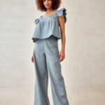 LNIANE SPODNIE LUCCA (tall) i TOP Z FALBANAMI ZESTAW - NIEBIESKIE