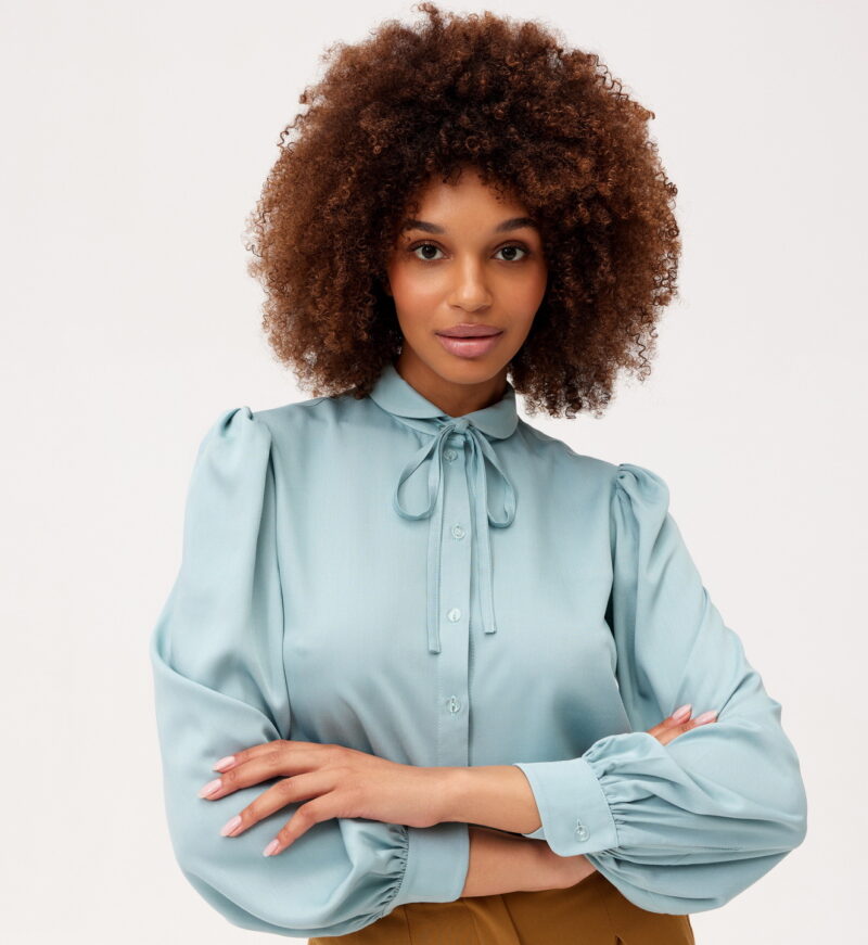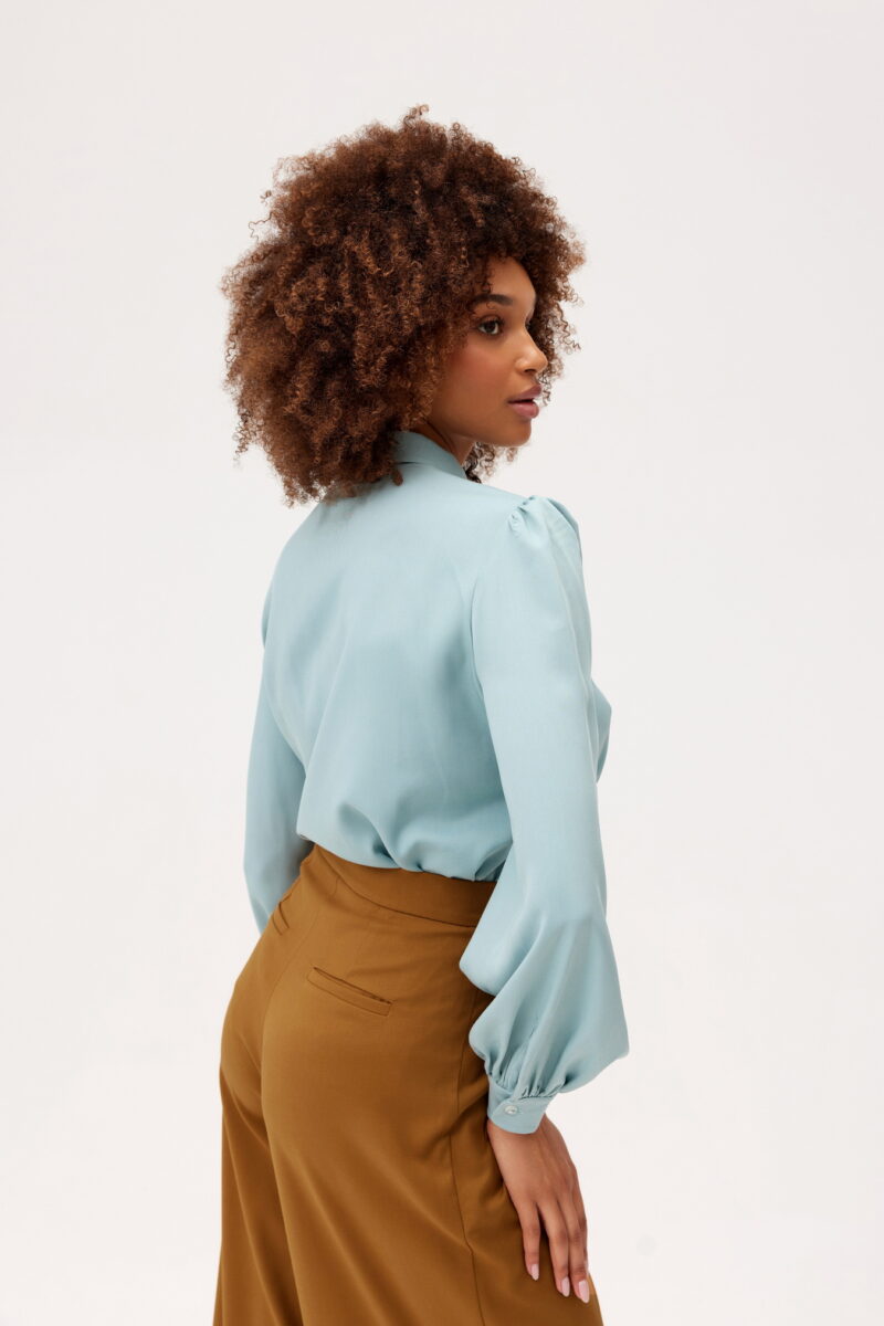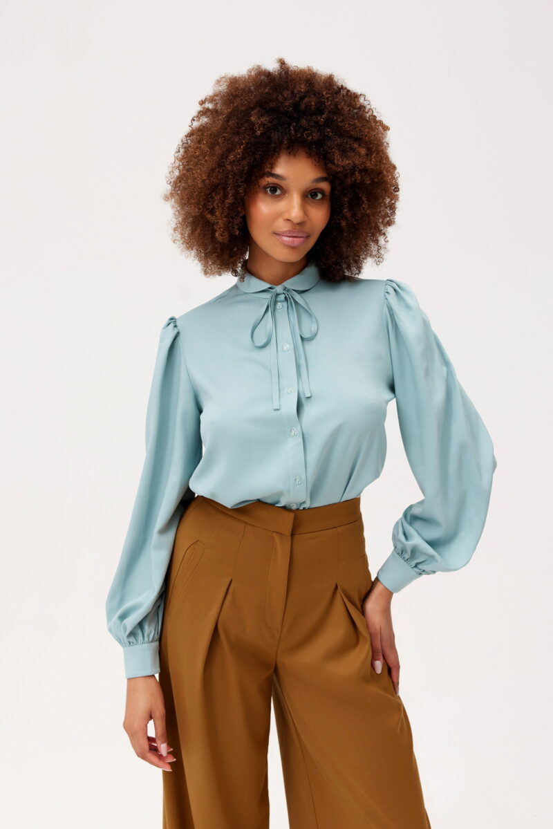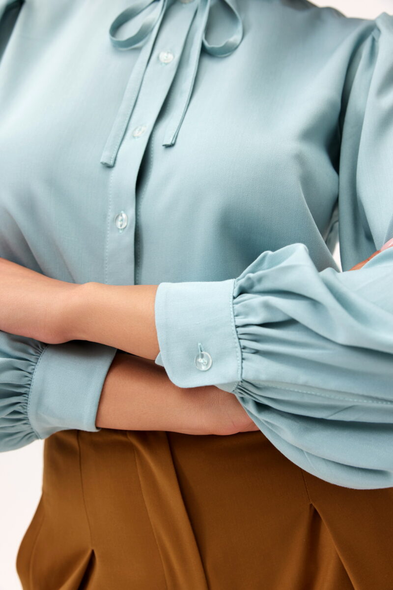 Bluzka wykonana ze 100% tkaniny wiskozowej, charakteryzująca się wiązaniem pod szyją i długimi rękawami. Mankiety posiadają rozcięcia z zapięciem na guziki, co dodaje elegancji i funkcjonalności. Dodatkowym atutem jest ozdobne wiązanie oraz troczki z tej samej tkaniny, które podkreślają styl bluzki. Bluzka zapinana jest na guziki z przodu, co ułatwia jej zakładanie i zdejmowanie.