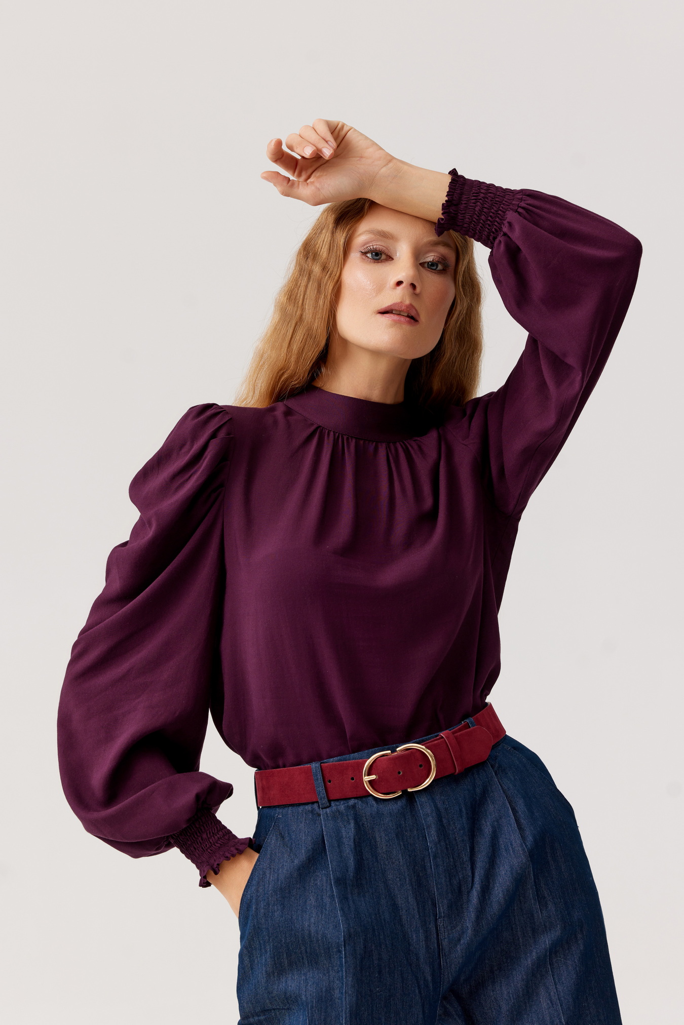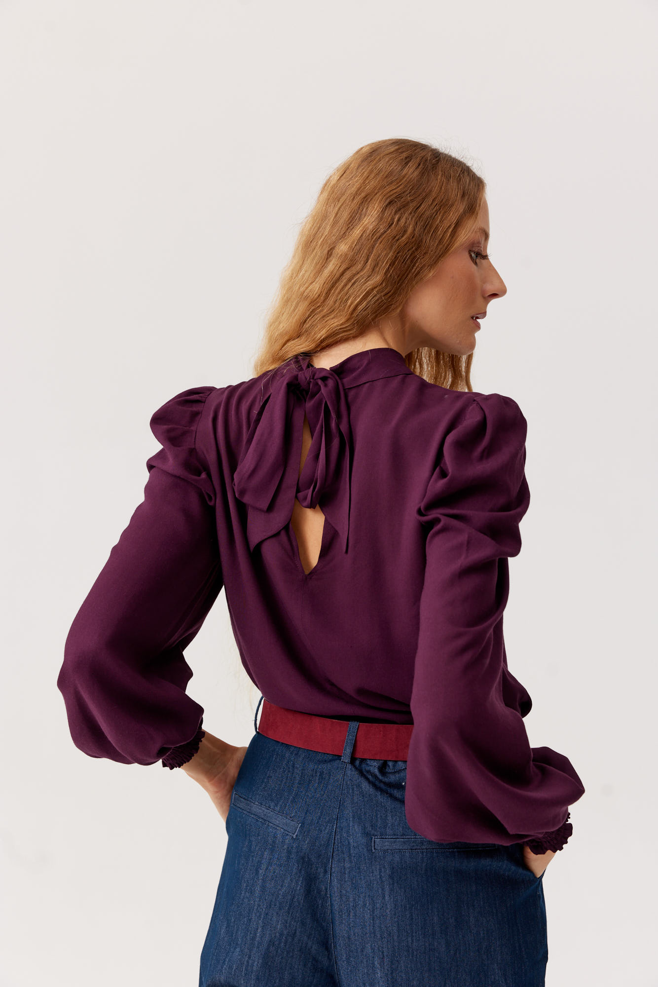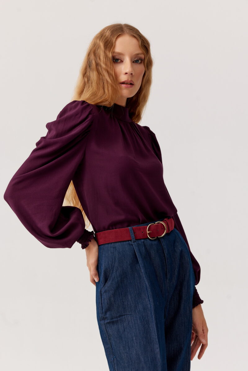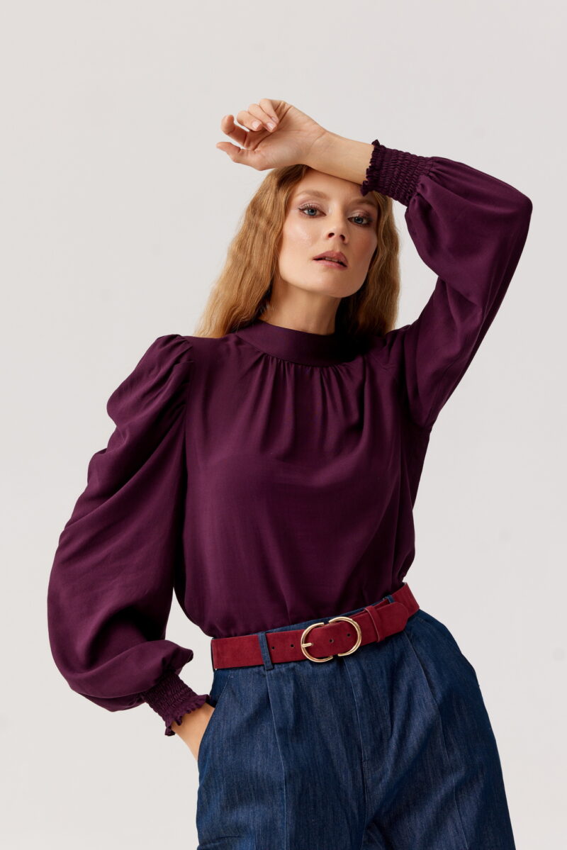 Elegancka i niezwykle kobieca bluzka wykonana z wysokiej jakości wiskozy w kolorze głębokiej śliwki. Zaprojektowana z myślą o wyjątkowych okazjach, jak i codziennych stylizacjach, zachwyca delikatnym połyskiem i zwiewną strukturą.