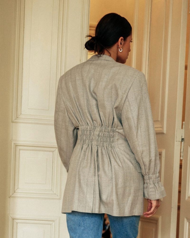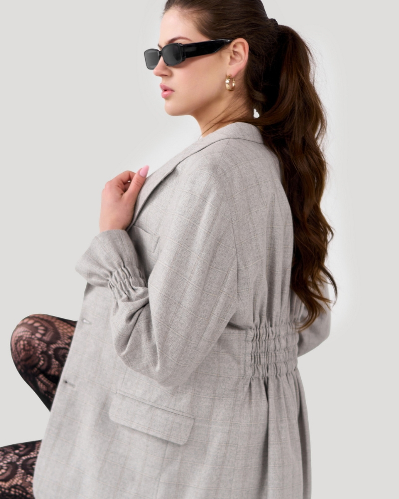 Stylowa i funkcjonalna marynarka wykonana z wysokogatunkowej wełny z drugiego obiegu. Jasnoszara tkanina w delikatną kratę nadaje jej elegancki, uniwersalny charakter. Taliowany krój optycznie wydłuża sylwetkę, a gumy w talii dają możliwość idealnego dopasowania. Klasyczna forma pasuje zarówno do jeansów, jak i eleganckich stylizacji.