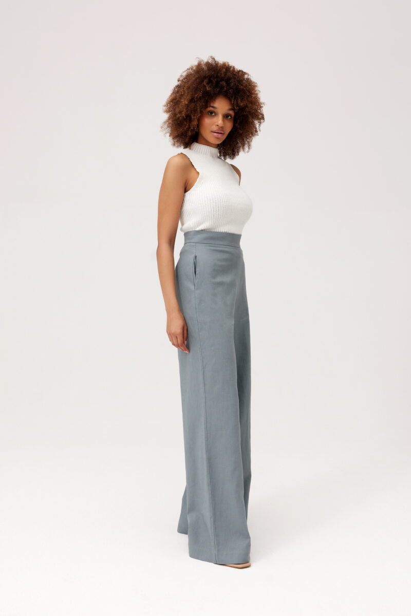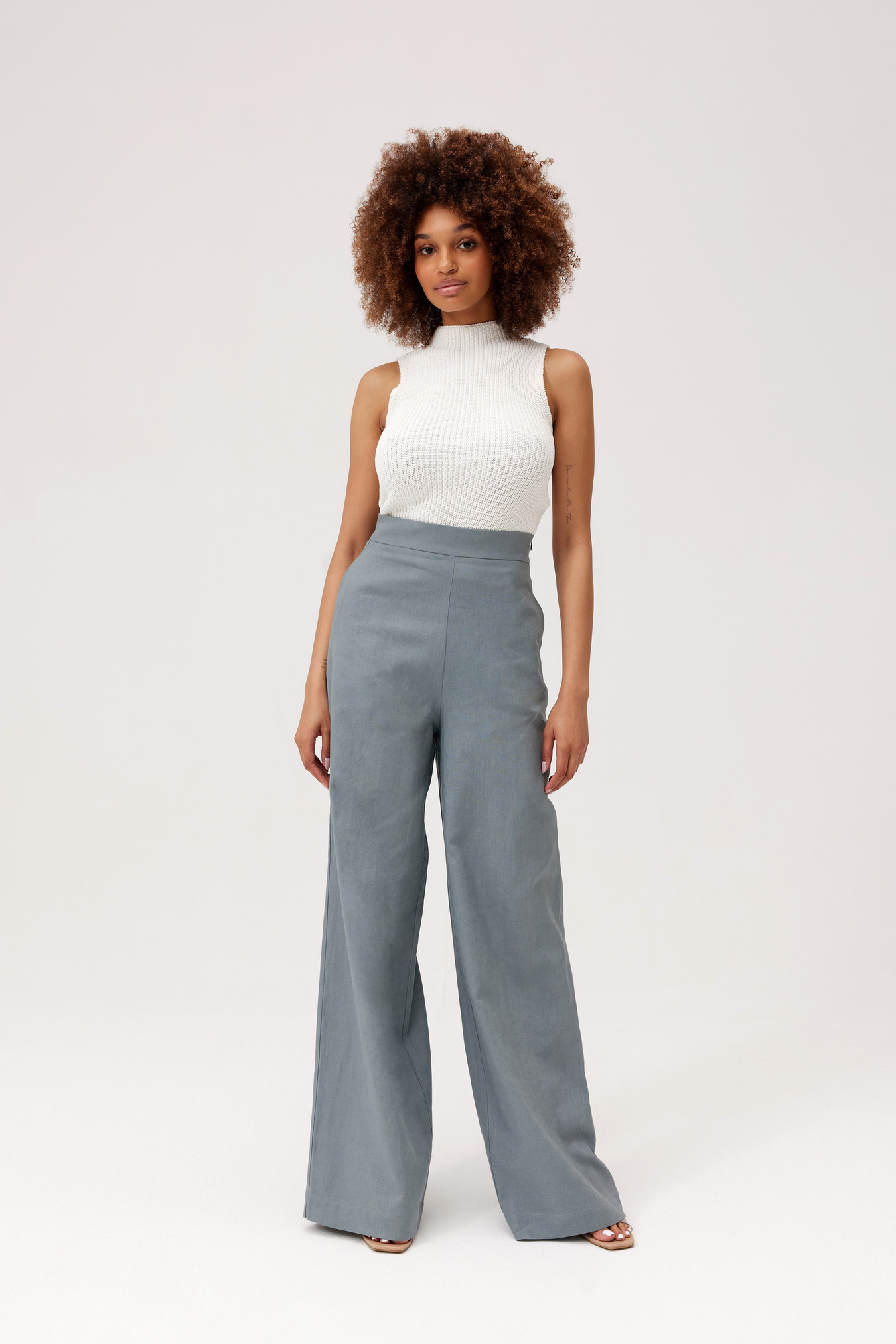 Spodnie wykonane ze 100% tkaniny lnianej, idealne na ciepłe dni. Charakteryzują się wysokim stanem oraz szeroką nogawką co zapewnia elegancki wygląd i wygodę noszenia. Posiadają praktyczne kieszenie z boku.  Zapięcie na suwak gwarantuje komfortowe i pewne dopasowanie. Idealnie komponują sie z topem z falbanami w tym samym kolorze.