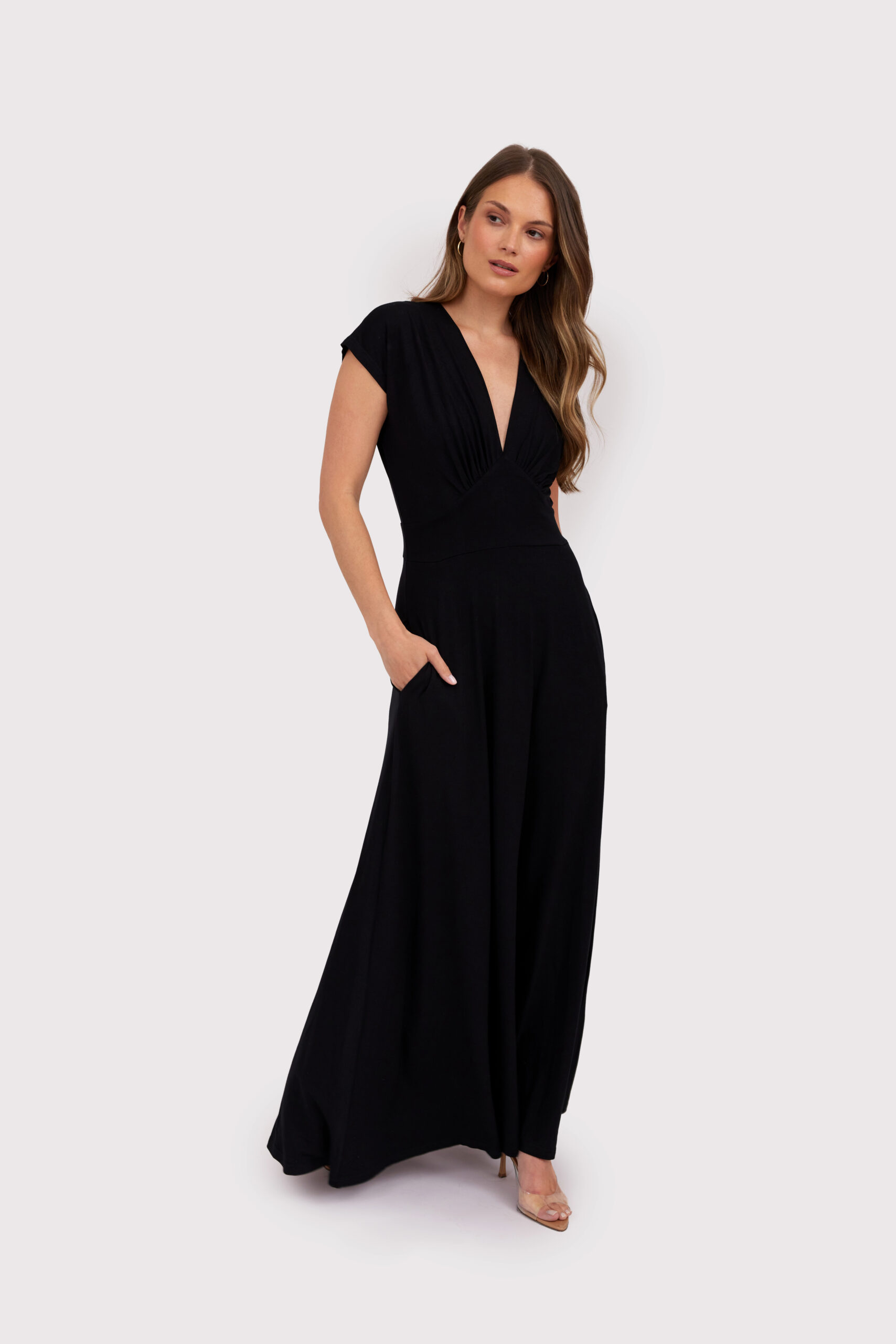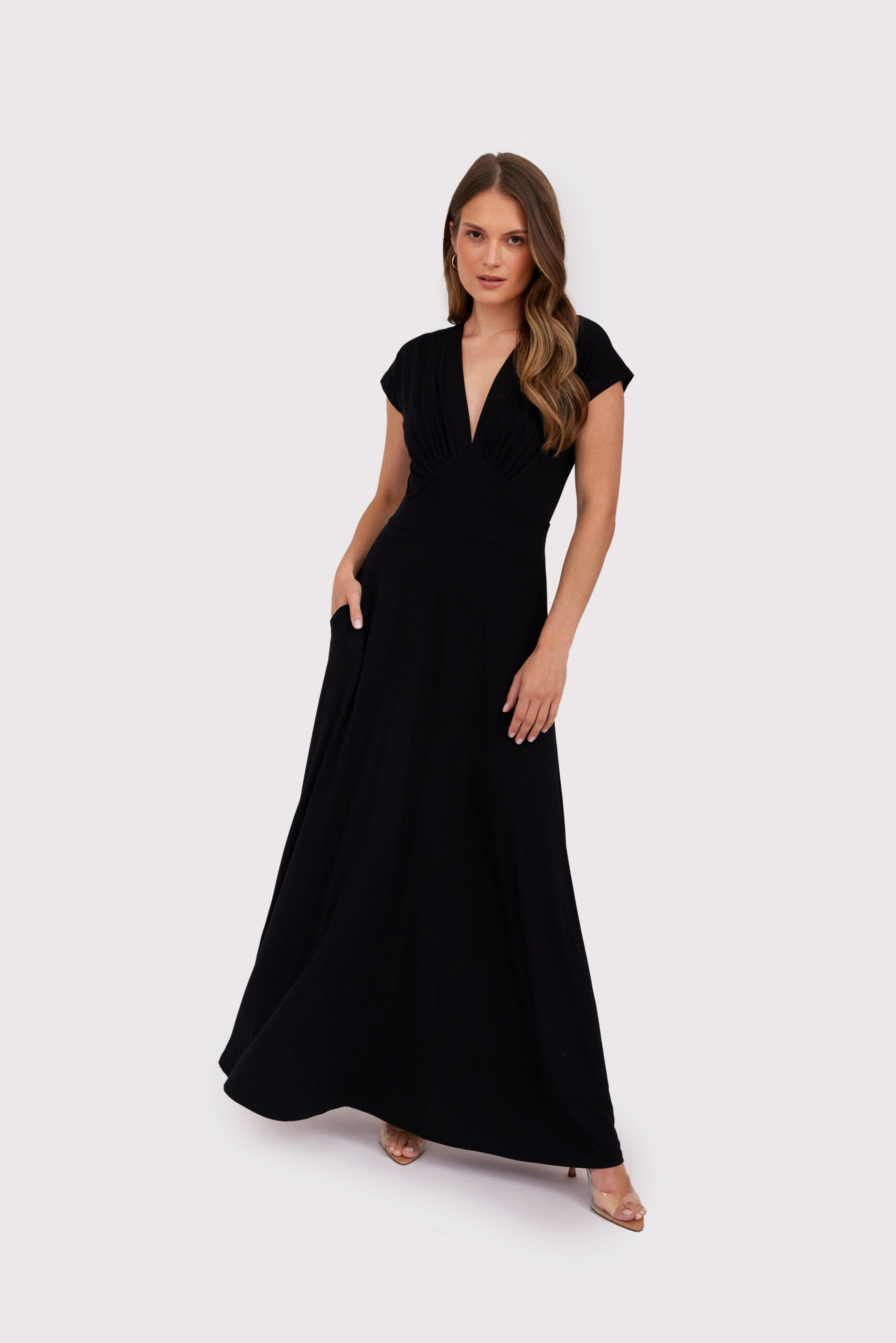 Zachwycająca czarna sukienka maxi z dekoltem w kształcie litery V, uszyta z przyjemnej, miękkiej , wysokogatunkowej wiskozowej dzianiny. Idealna na wieczorne wyjścia, specjalne okazje i eleganckie spotkania. Krój dopasowany w talii pięknie podkreśla sylwetkę, a rozkloszowany dół nadaje jej lekkości. Ponadczasowa klasyka w nowoczesnym wydaniu.