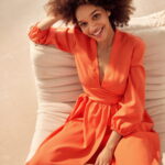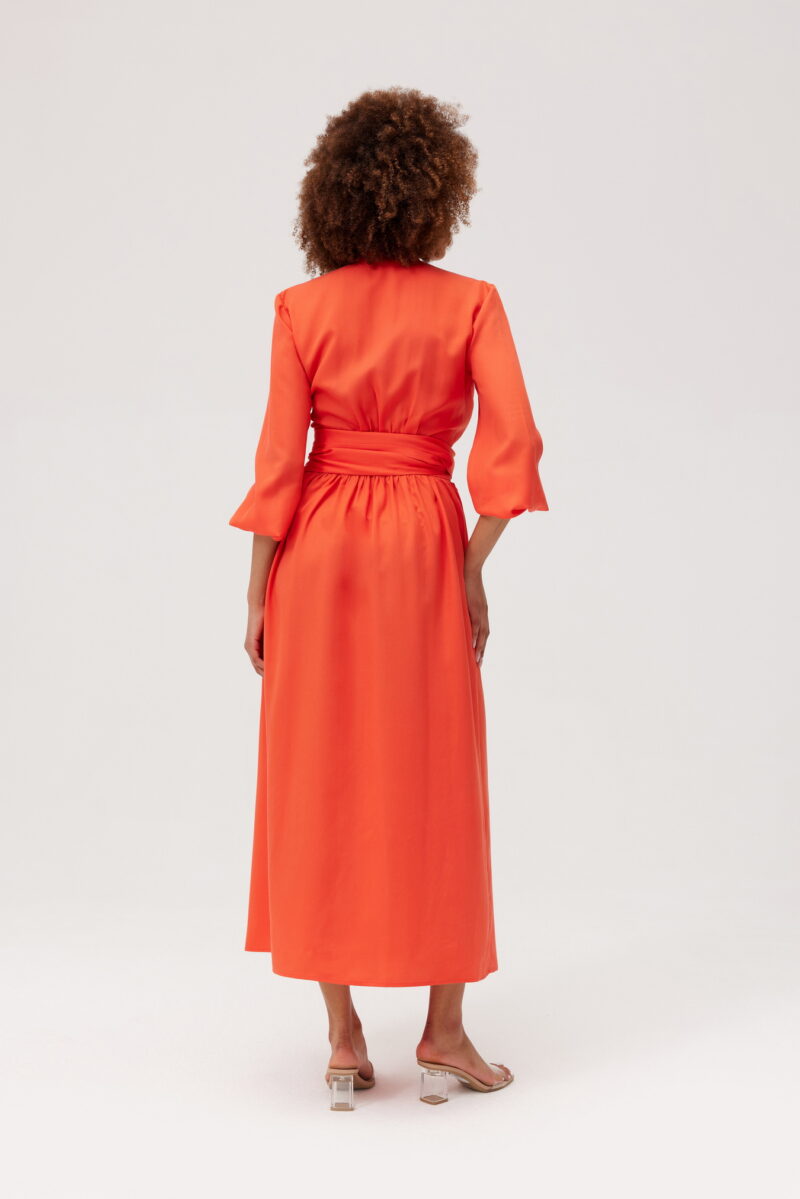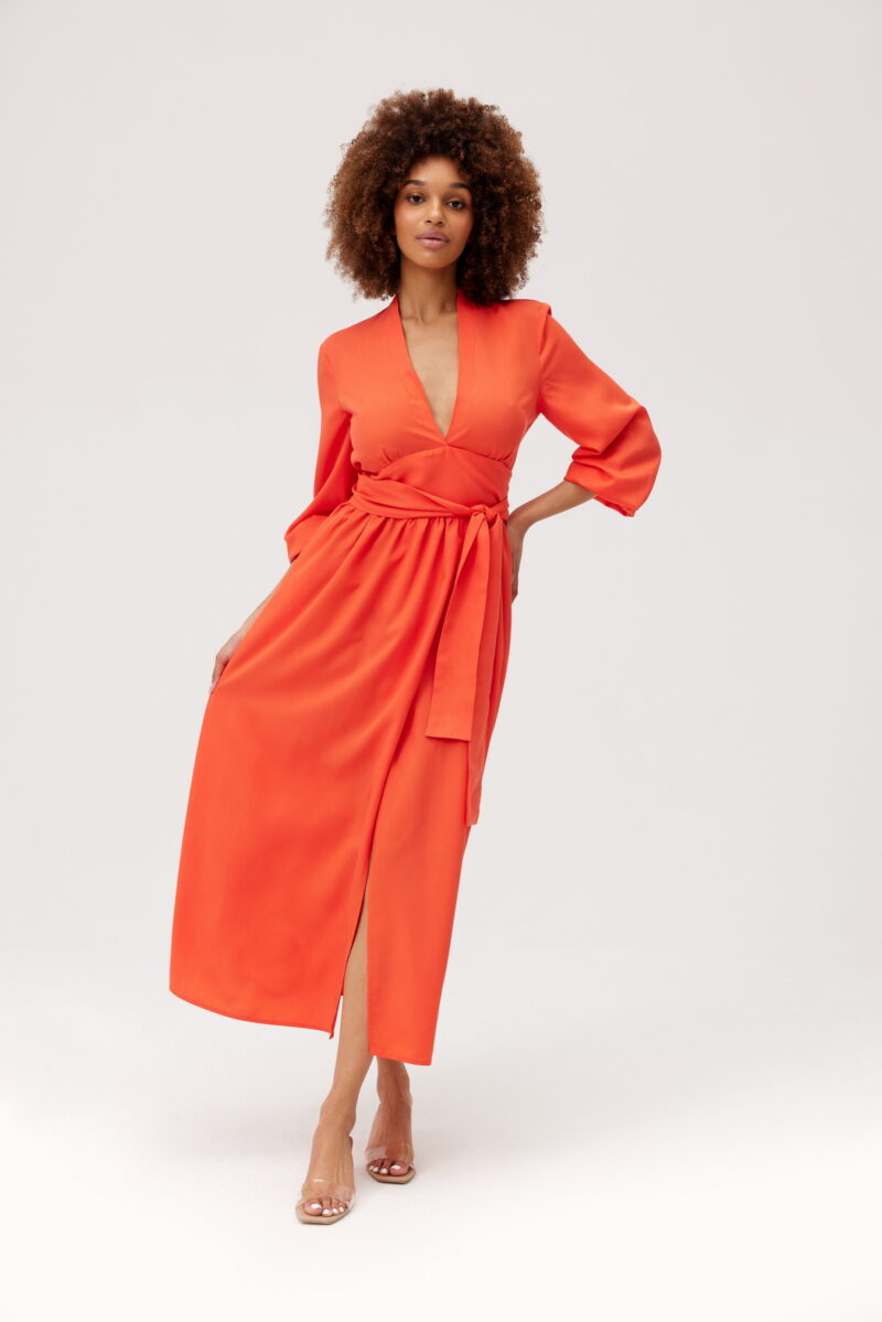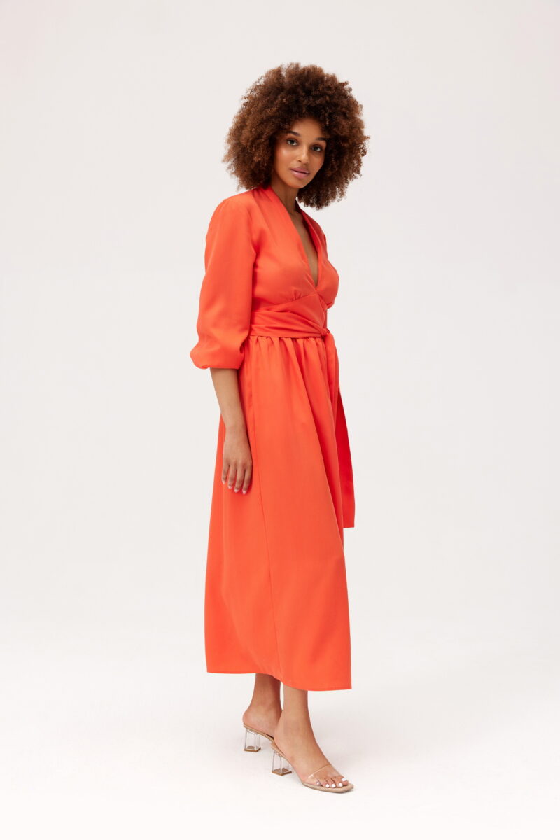 Stylowa sukienka z dekoltem w serek i bufiastymi rękawami o średniej długości wykonana z wysokiej jakości tkaniny Tencel. Kopertowe wiązanie w pasie podkreśla talię, a praktyczne kieszenie po bokach zwiększają funkcjonalność. Idealna zarówno na lato, jak i wczesną jesień, zapewnia komfort i elegancję w każdej sytuacji.