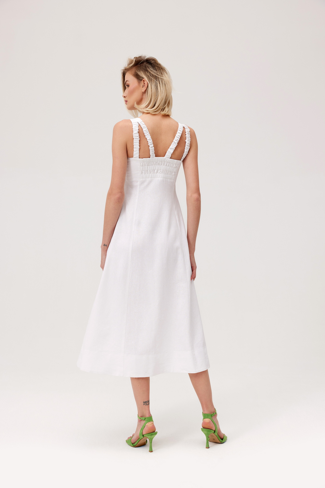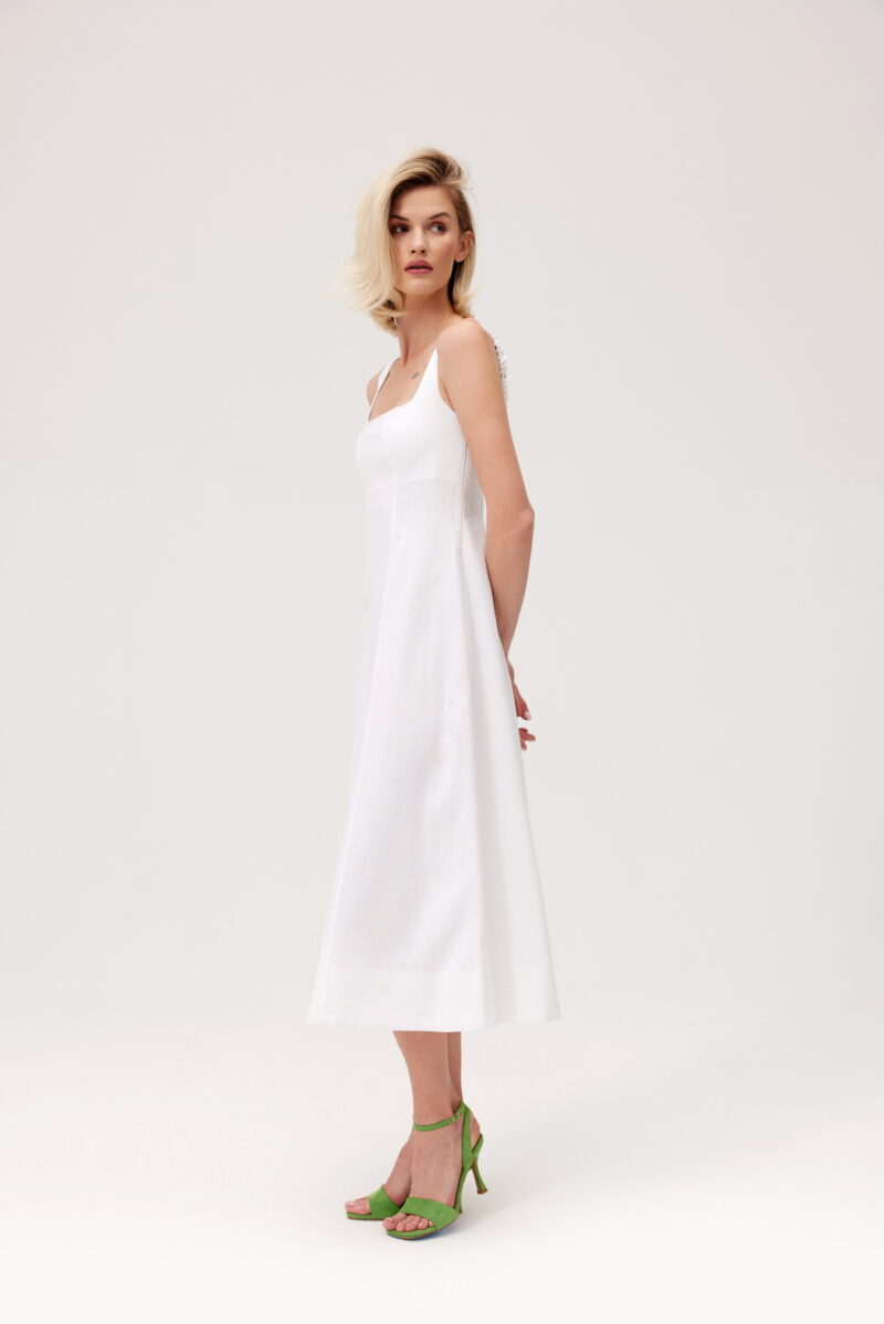 Sukienka wykonana z najwyższej jakości tkaniny naturalnej. Posiada dekolt w karo oraz regulowane na gumie ramiączka i plecy. Łatwo dostosowuje się do sylwetki, pięknie ją podkreślając.