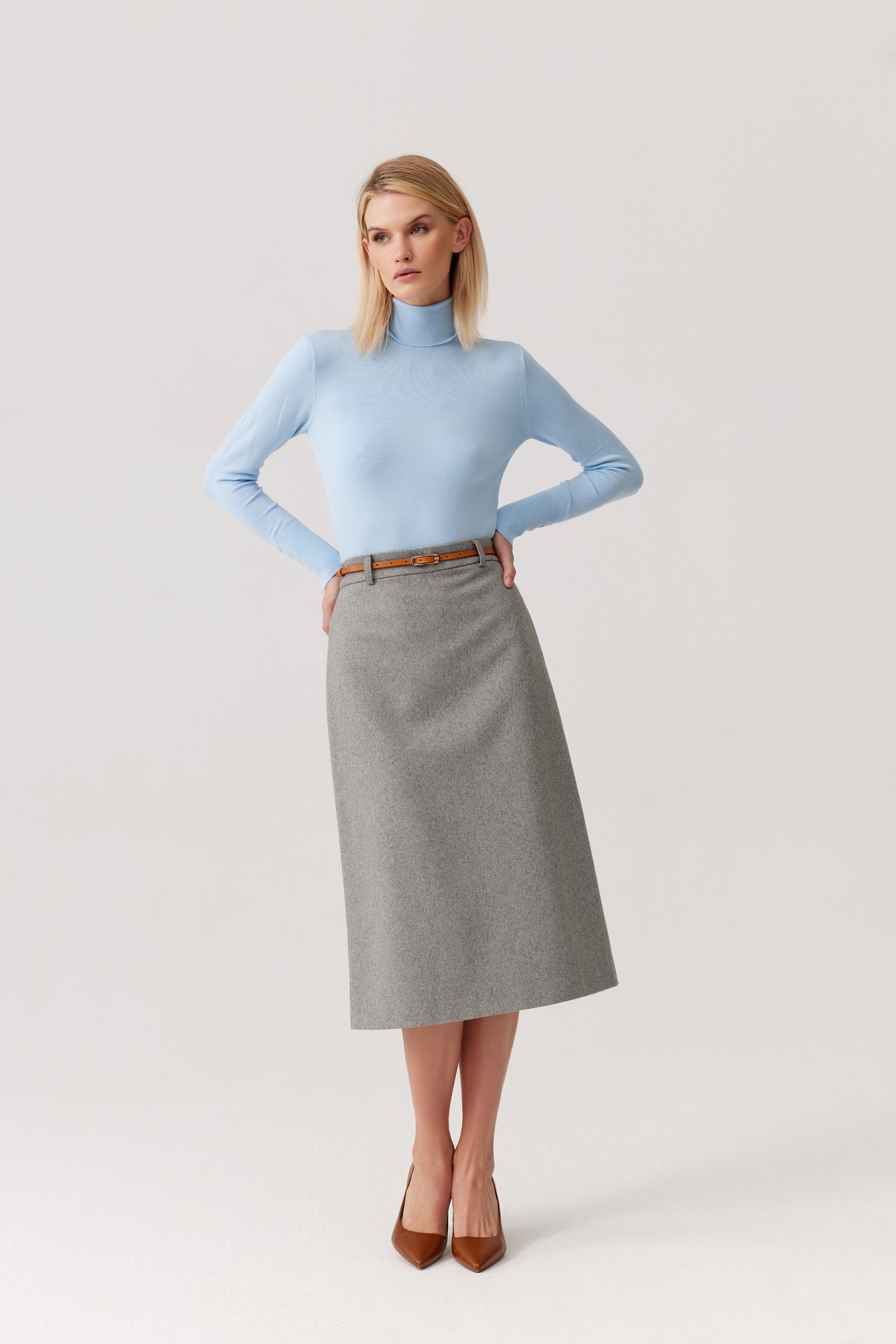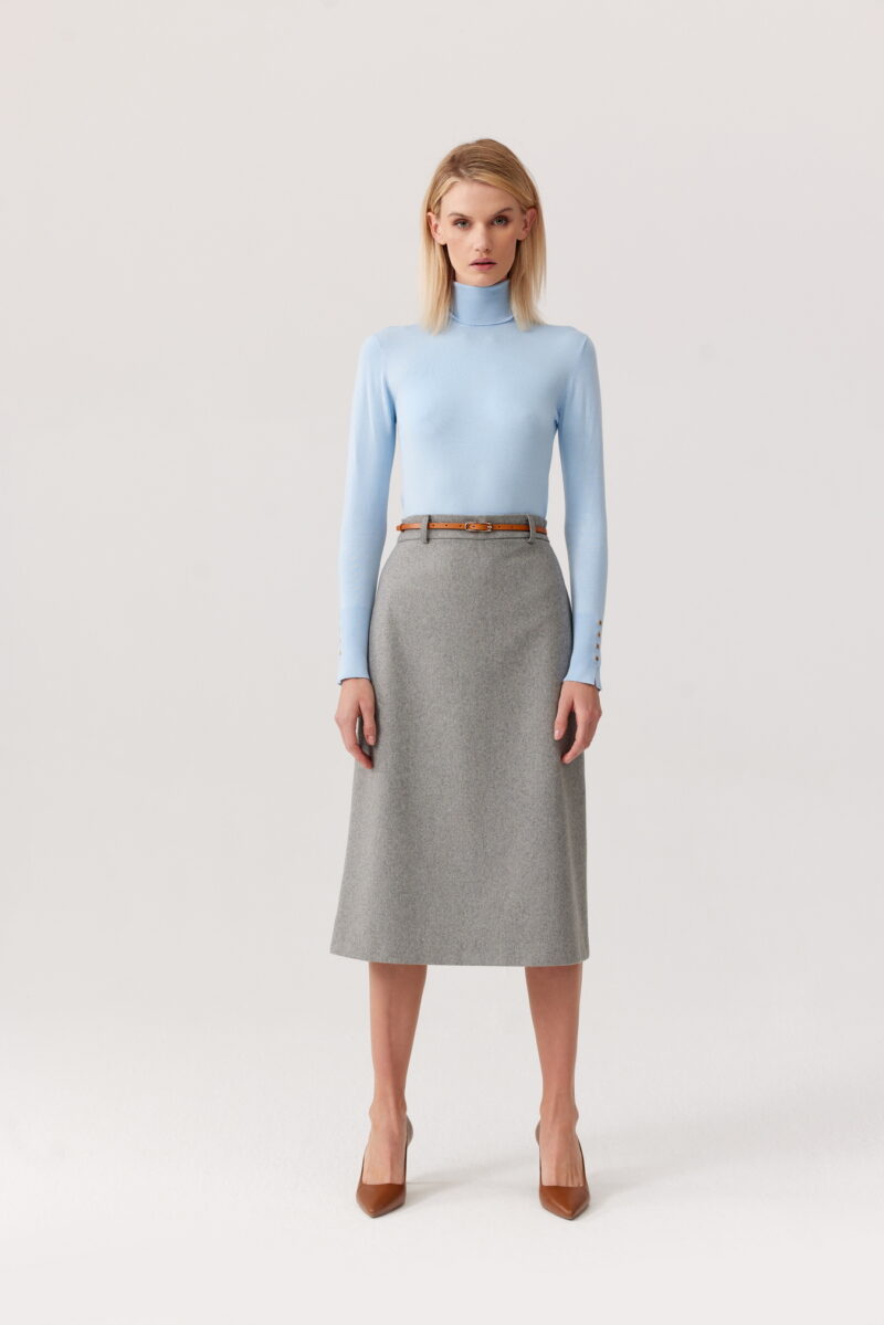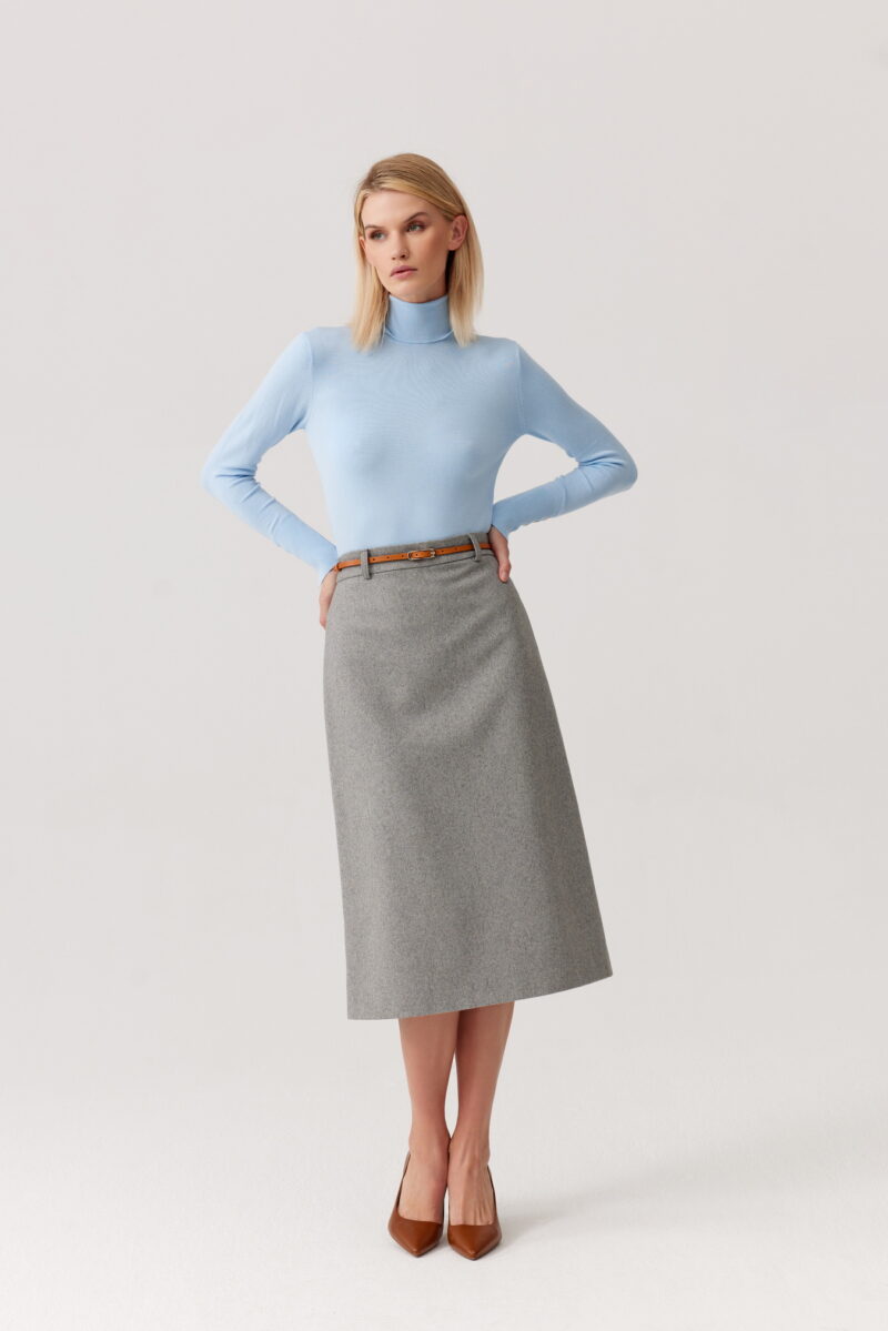 Wykonana z naturalnej, miękkiej wełny, zapewnia komfort noszenia nawet w chłodniejsze dni. Dopasowany krój z wysokim stanem subtelnie modeluje sylwetkę, a długość za kolano sprawia, że spódnica sprawdzi się zarówno w codziennych stylizacjach biurowych, jak i podczas bardziej formalnych okazji.