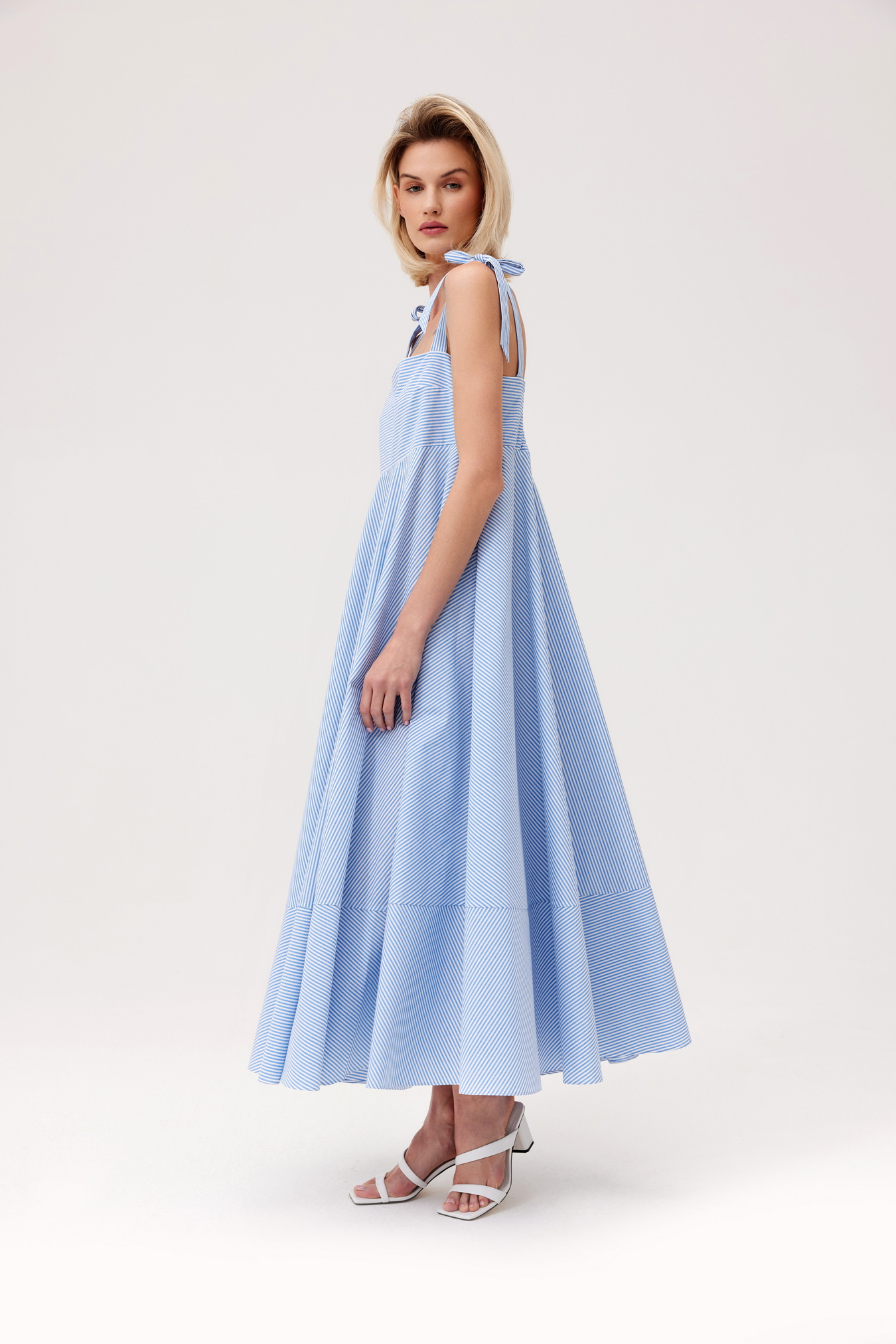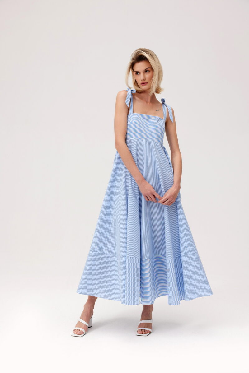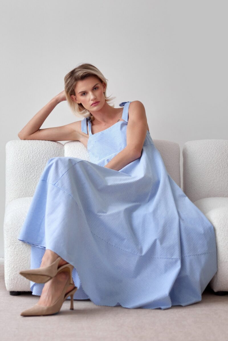 Sukienka wykonana w 100% z najwyższej jakości tkaniny bawełnianej w delikatne niebieskie paski. Posiada prostokątny dekolt oraz ramiączka o regulowanej długości dzięki możliwości ich wiązania. Dół sukienki bardzo mocno rozkloszowany z bocznymi kieszeniami. Idealna na letnie spacery i romantyczne wieczory.