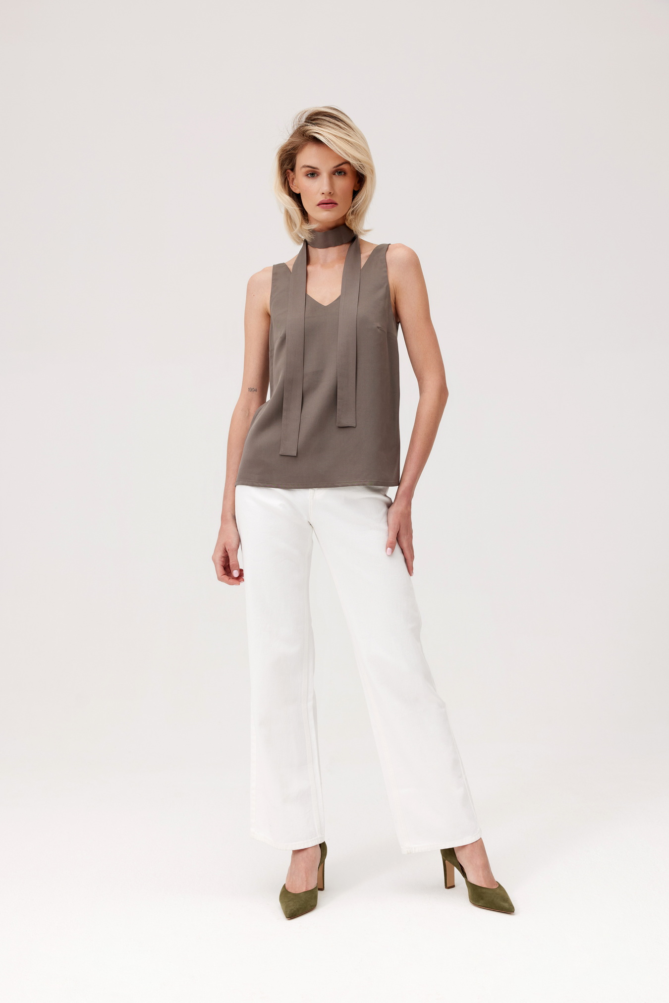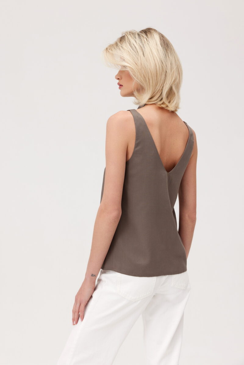 Top z delikatnej tkaniny tencel charakteryzuje się podwójnym dekoltem w serek oraz cienkimi ramiączkami. Ten elegancki top jest uzupełniony szalem, który dodaje mu stylu