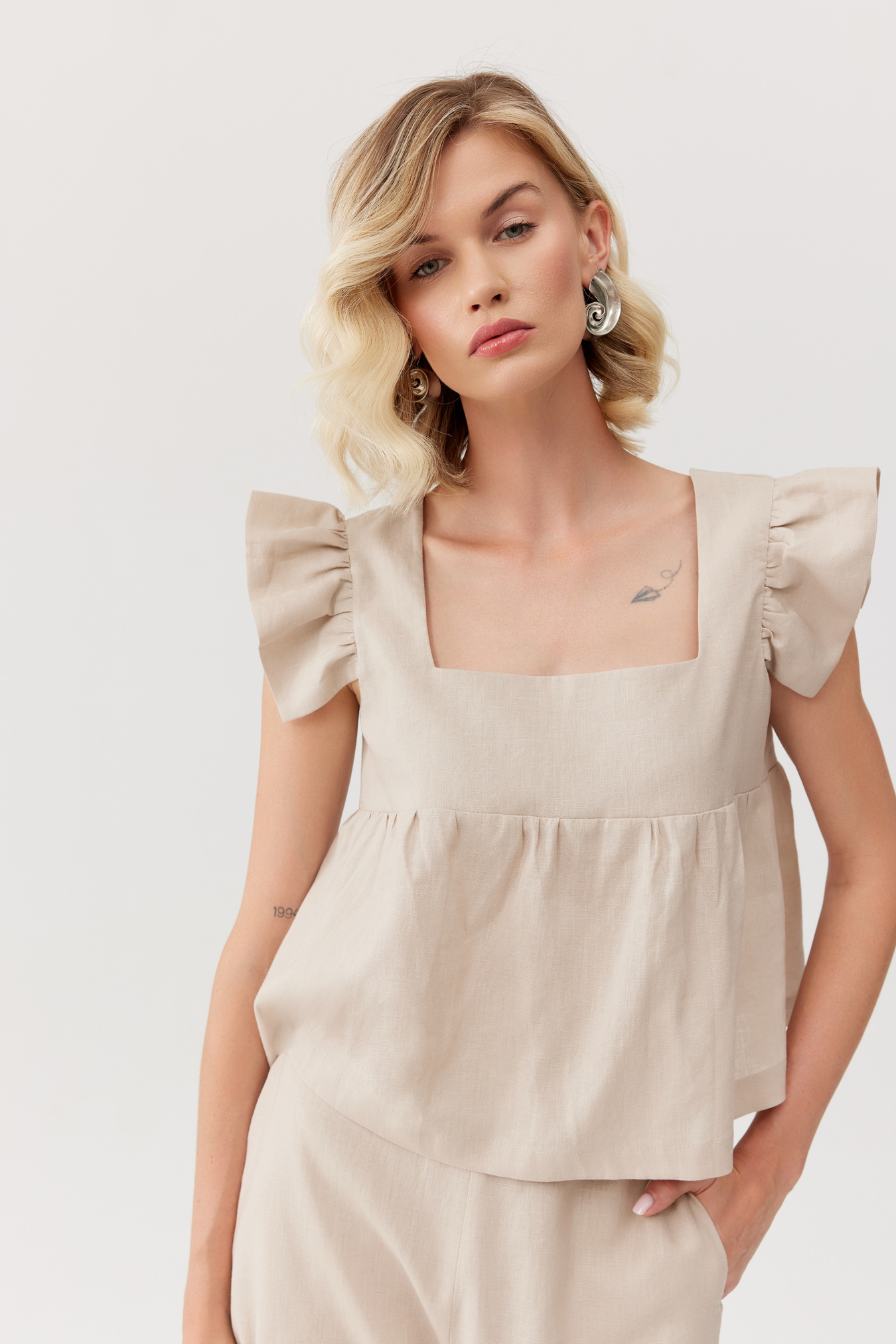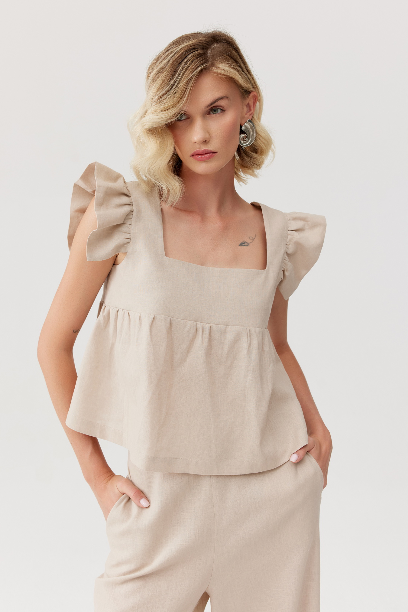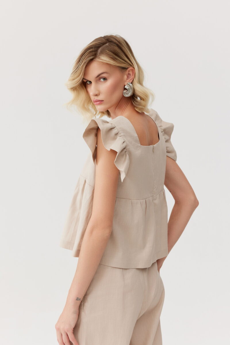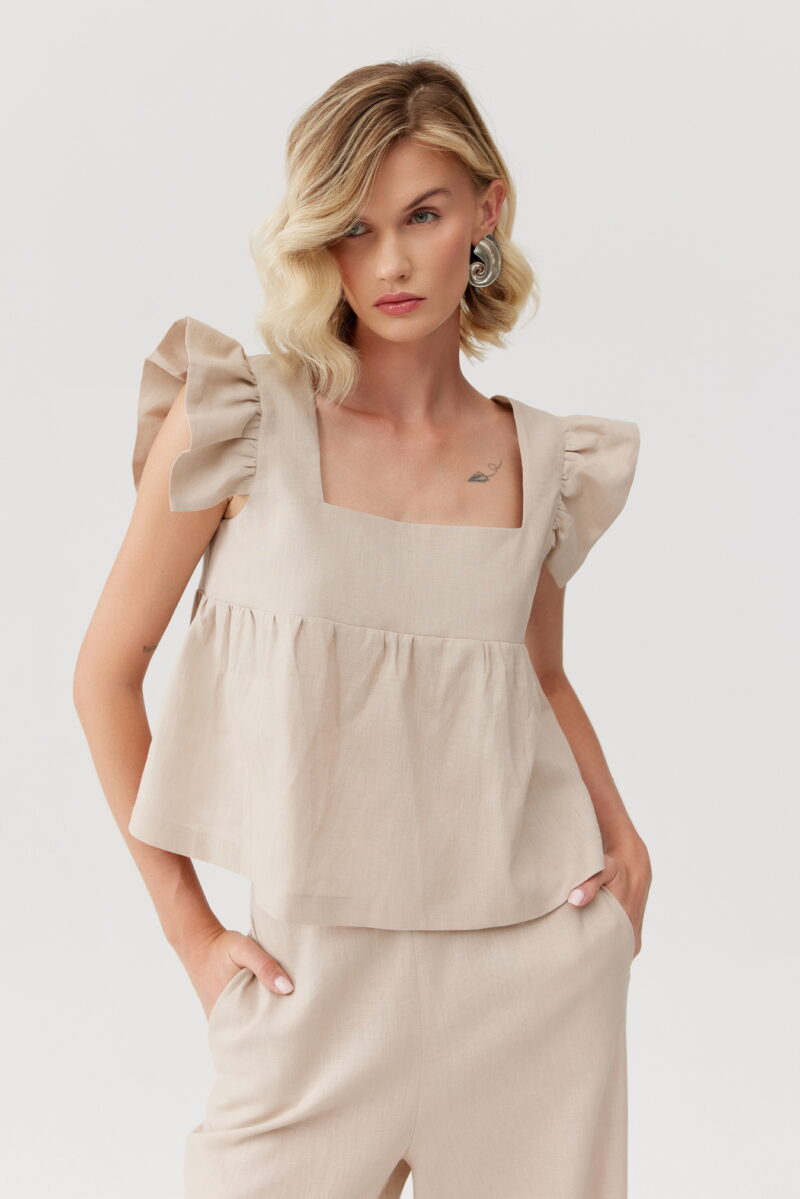 Elegancki i przewiewny top wykonany z naturalnego lnu. Szerokie ramiączka ozdobione są delikatnymi falbankami, które dodają uroku i kobiecości. Top świetnie komponuje się z lnianymi spodniami w tym samym kolorze, tworząc stylowy look.